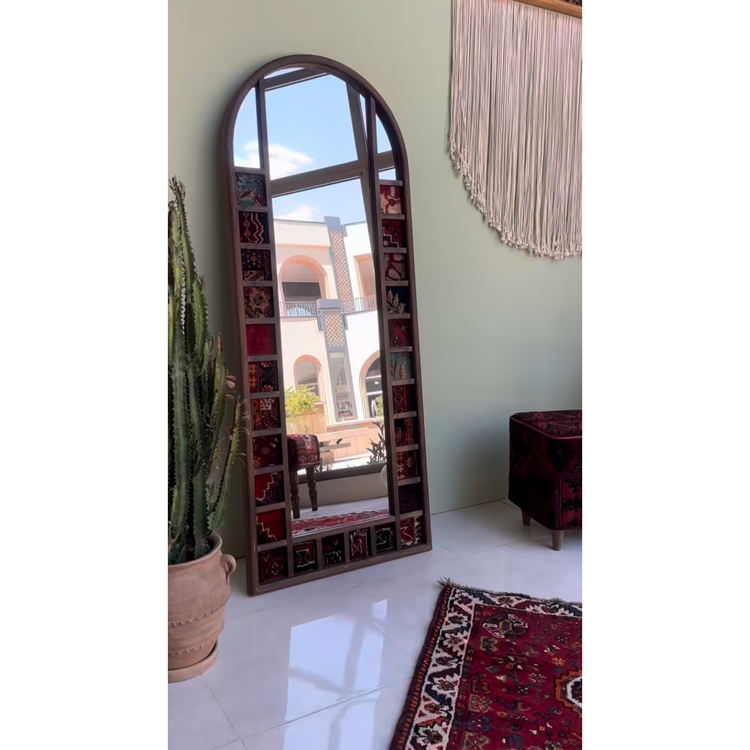 آینه قدی چوبی ترکیبی با فرش دستبافت، تلفیقی هنرمندانه از طراحی کاربردی و هنر سنتی ایرانی است که جلوهای گرم و منحصربهفرد به فضای داخلی میبخشد. قاب چوبی مستحکم در کنار جزئیات ظریف فرش دستبافت، این آینه را به یک قطعه دکوراتیو خاص و چشمنواز تبدیل کرده است. این محصول علاوه بر کاربرد روزمره برای بازتاب نور و افزایش حس فضا، بهعنوان یک عنصر تزئینی، هویت و زیبایی بیشتری به نشیمن، اتاق خواب یا فضاهای سنتی و مدرن اضافه میکند